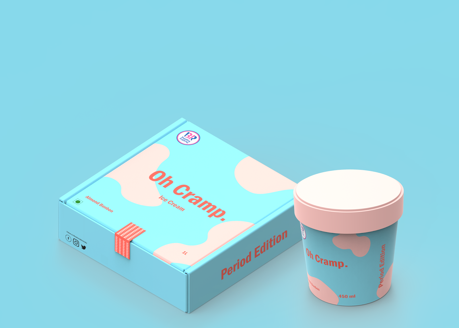 Кольорова палітра лінійки заспокоює і випромінює комфорт, який є дуже важливим для жінок під час критичних днів. Упаковка морозива Baskin Robbins об’ємом 1 л імітує піцу, що створює унікальні відчуття і викликає хвилювання. Згори на упаковці є фраза, що одразу запам’ятовується, – «Oh Cramp». Це модифікована версія популярної фрази «oh shit». Серед молоді це викликає гумор і створює прихильність до бренду.