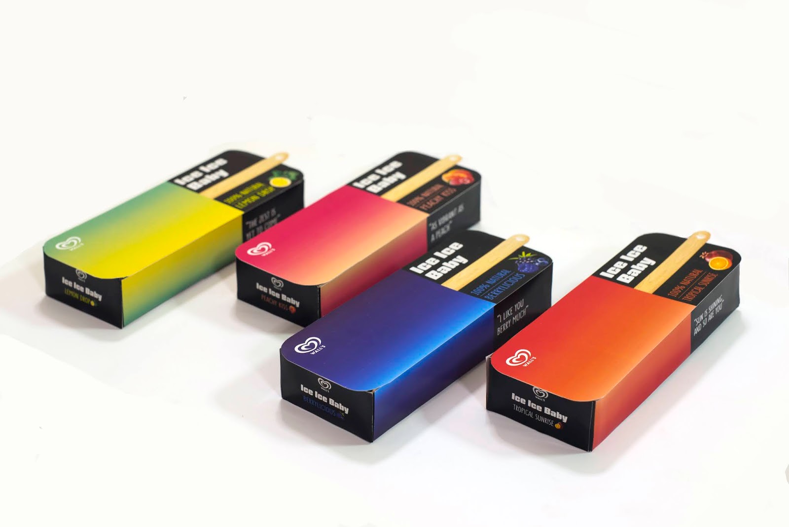 Через те, що морозиво часто тане, у багатьох брудняться через це руки. Для вирішення цієї проблеми була створена інноваційна упаковка, нижню частину якої можна використати як лоток, аби руки не бруднилися. Ice Ice Baby має чотири освіжальні смаки і є чудовим вибором для міленіалів, які прагнуть більш здорового й екологічно безпечного образу життя. Дизайнери розробили яскраву і захопливу упаковку, для якої використали привабливі кольорові переходи і лінії. «Ice Ice Baby» намагається створити свіжий сегмент в жанрі індійського морозива. Дизайн упаковки викликає відчуття радості і підіймає настрій.