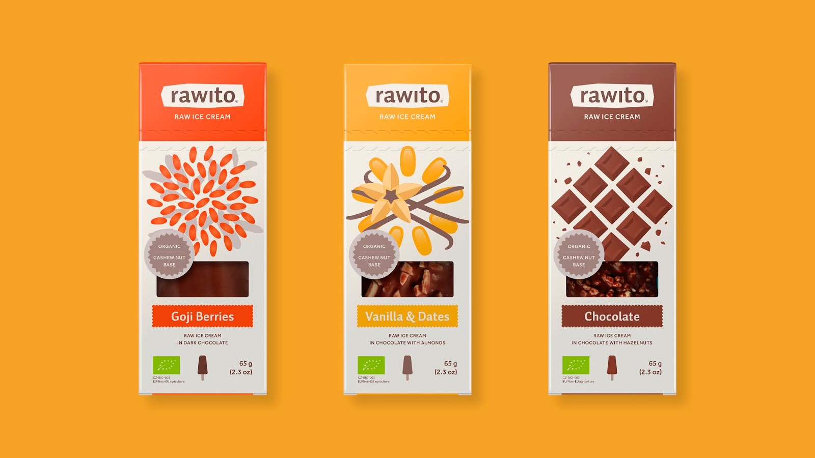 Лінійка продукту Rawito – це веганське морозиво без глютену і лактози. Морозиво у графічній студії Matěj Kočka представили за допомогою тонкої графіки, де стилізовані інгредієнти групуються й утворюють сакральну геометрію. У такий спосіб упаковка відображає як естетичні, так і екологічні аспекти виробництва.