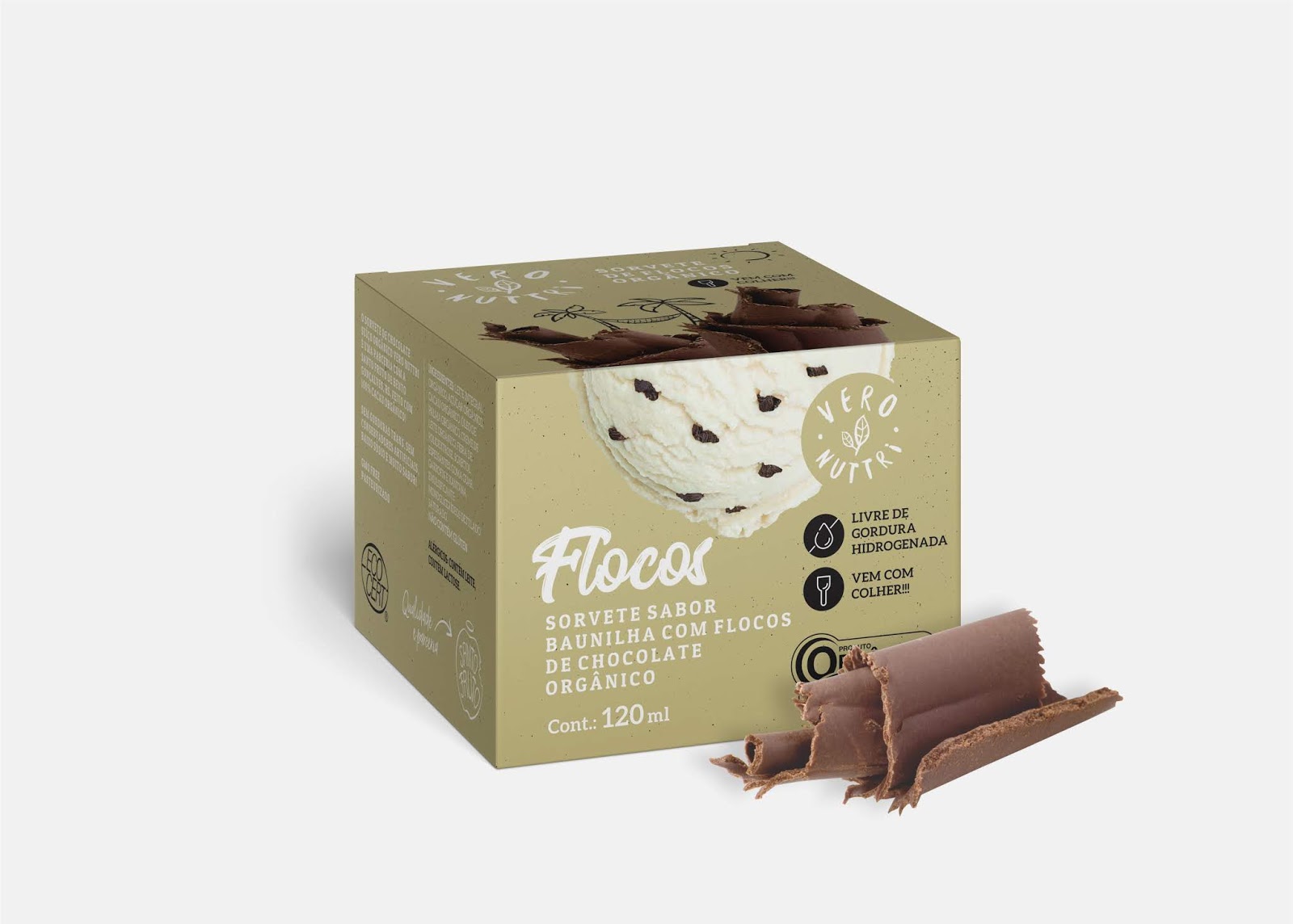 Органічне морозиво Veronuttri випускається окремими порціями, які можна вживати одразу, адже у коробках є ложечка із переробленої деревини. Рішення використати паперові коробки для окремих порцій дозволило максимально використати невеличку упаковку, розширивши візуальну складову, яка покращила презентацію продукту.