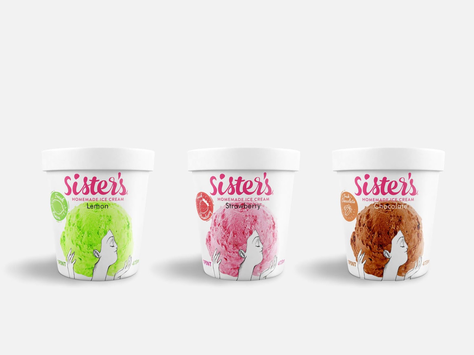 А це – домашнє морозиво, приготоване трьома сестрами. Власниці хотіли, аби їхній бренд був жіночним і представляв морозиво, зроблене жінками. Для замовників було дуже важливо показати концепцію сестринства водночас із якісним продуктом у дизайні цієї упаковки.