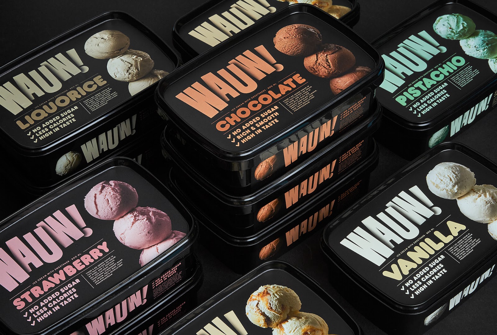 Креативна агенція Snask створила для бренду морозива Wauw упаковку, що вигідно вирізняється з-поміж конкурентних товарів, адже обрала основним кольором для неї чорний. Керуючись прагненням уникнути розкоші, було використано «смачну» і «добру» типографіку й форму. Для зображення було прийнято рішення обрати кульки морозива. Також дизайнери додали тінь до логотипу, аби він гармоніював із тінями кульок морозива.