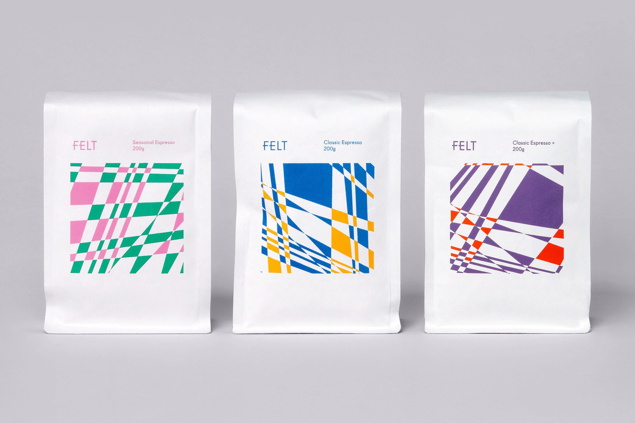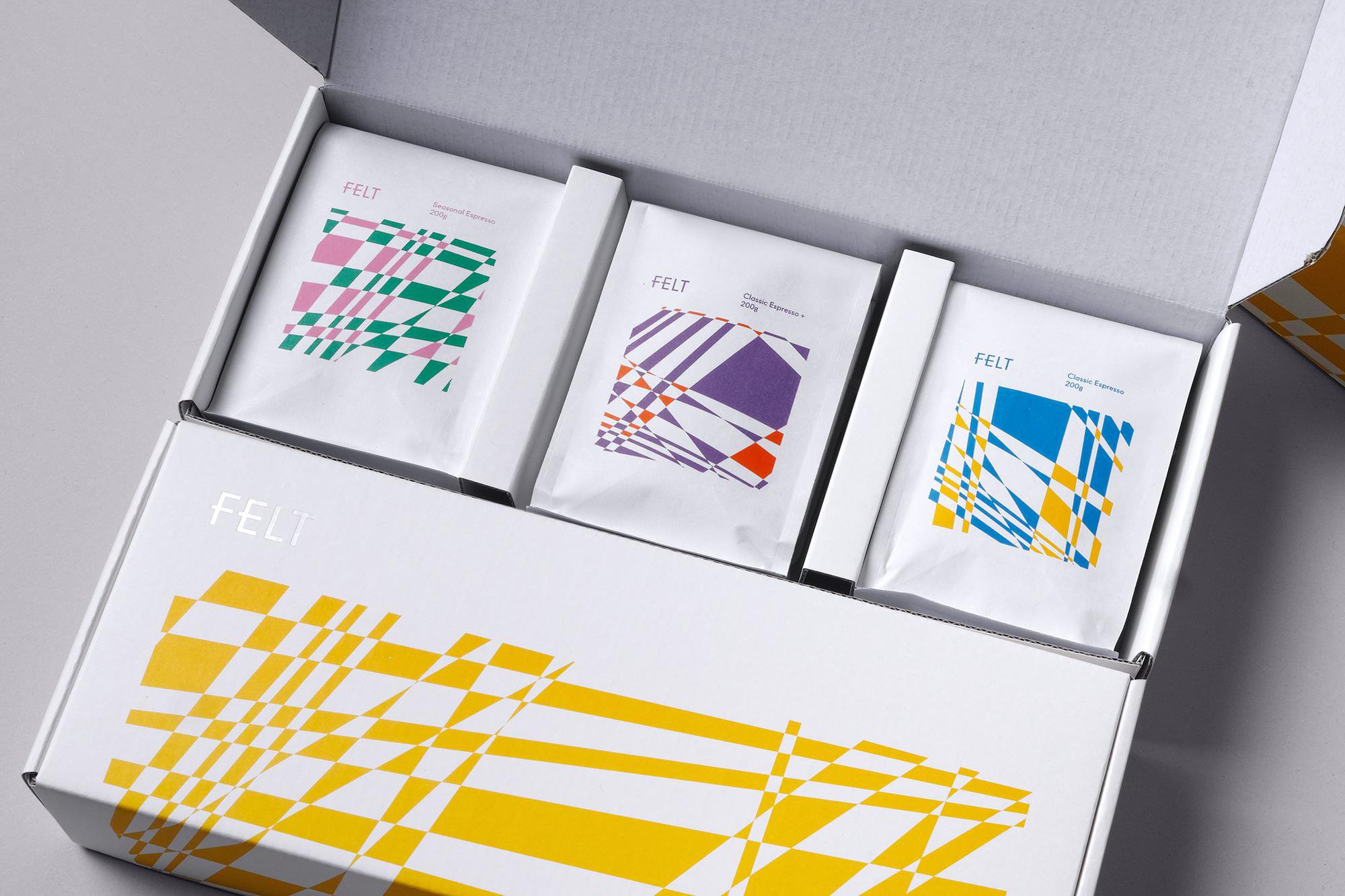 FELT – кав’ярня в Сеулі із власним брендом кави. Студія графічного дизайну Studio fnt разом із Felt створили візуальну ідентичність для упаковок серій кави. Це простий і фактурний, а також точний і безпосередній дизайн, об’єднаний продуманою і тонкою концепцією – лінії, що перетинаються, розмежування і перетинання простору.